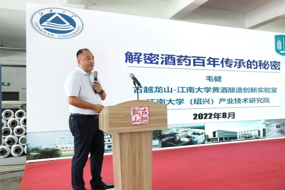 紹興市黃酒行業(yè)協(xié)會會長徐明光、紹興市人民政府辦公室二級巡視員施新民參加接種儀式,集團(股份公司)黨委書記、董事長孫愛保敲響酒藥制作“摏粉”第一錘,集團黨委副書記、古越龍山股份公司總經(jīng)理徐東良做2022年冬釀動員講話,江南大學(xué)教授毛健還揭秘百年“酒魂”。